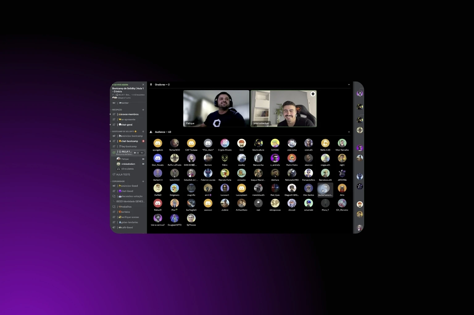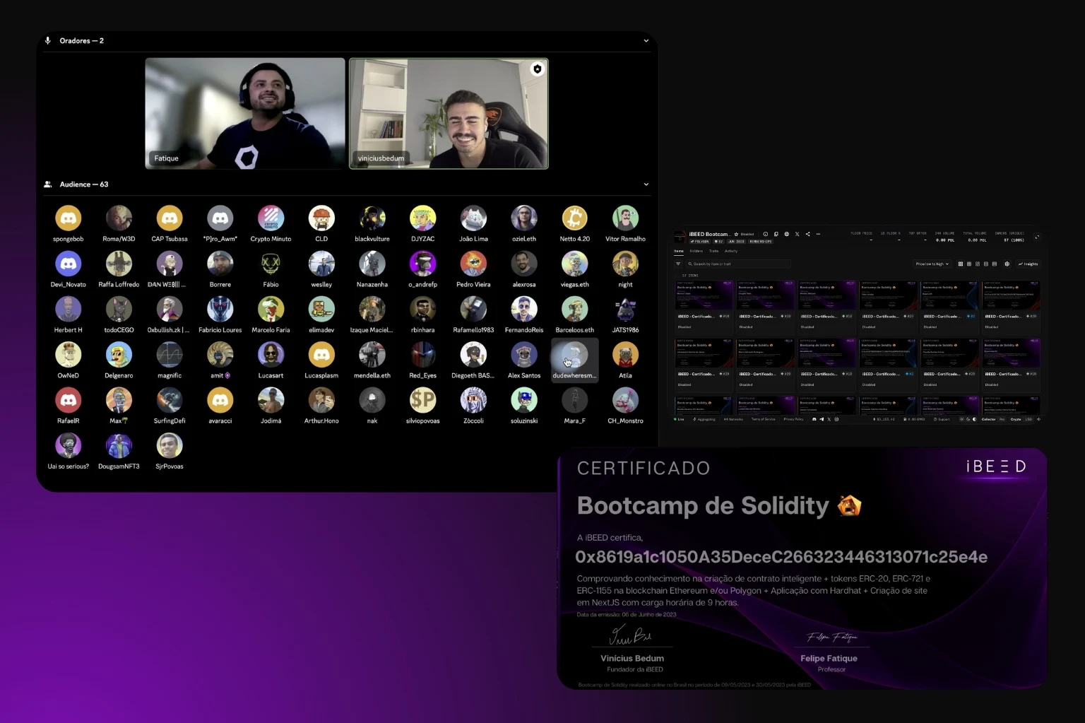 junto ao meu sócio na época, idealizamos e executamos bootcamps como Solidity, Coleção NFT Regenerativa e Discord, com inscrições ↗ e certificados de conclusão ↗ em NFT